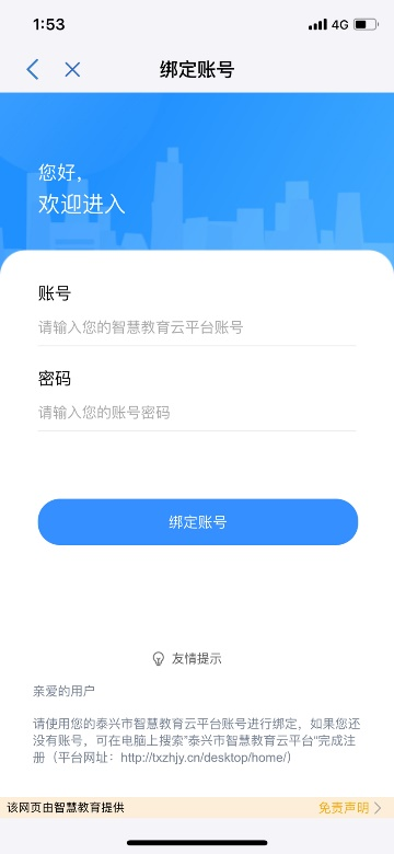 情況二:用戶(hù)有泰興市智慧教育云平臺(tái)賬號(hào),且沒(méi)有綁定應(yīng)用,進(jìn)入賬號(hào)綁定頁(yè)面,可輸入云平臺(tái)賬號(hào)和密碼,點(diǎn)擊【綁定賬號(hào)】完成綁定; 情況三:用戶(hù)有泰興市智慧教育云平臺(tái)賬號(hào)而且已經(jīng)綁定應(yīng)用,點(diǎn)擊應(yīng)用直接跳過(guò)賬號(hào)綁定頁(yè)面;