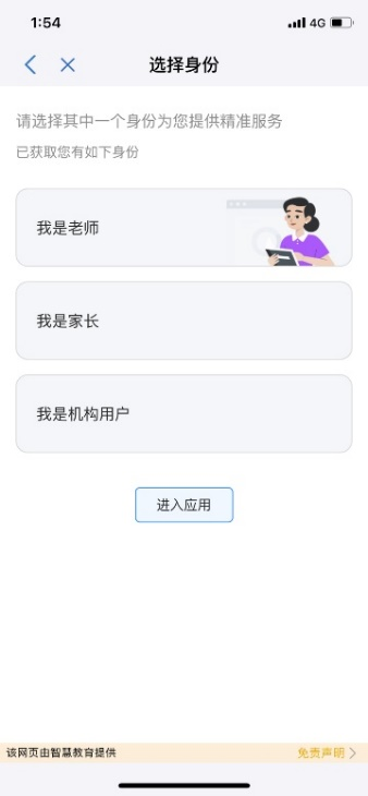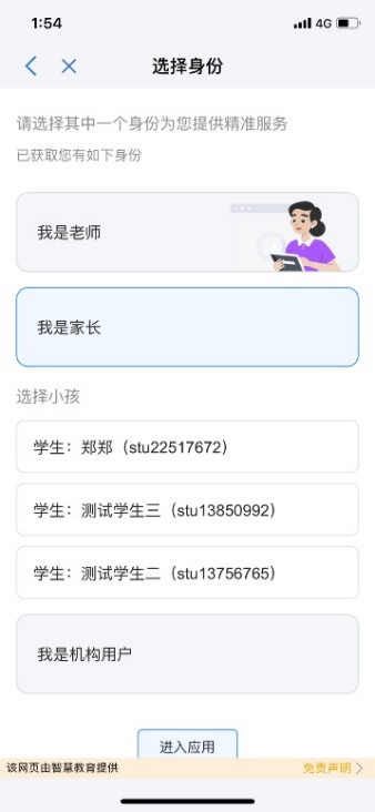 賬號(hào)綁定 選擇身份用戶(hù)登錄泰興一卡通APP,底部菜單點(diǎn)擊【生活服務(wù)】,在【校園教育】中點(diǎn)擊應(yīng)用,成功綁定賬號(hào)后,進(jìn)入選擇身份頁(yè)面,有以下兩種情況:情況一:用戶(hù)綁定的賬號(hào)有多重身份,成功綁定賬號(hào)后,進(jìn)入選擇身份頁(yè)面,用戶(hù)可選擇其中一個(gè)身份,點(diǎn)擊【進(jìn)入應(yīng)用】;情況二:用戶(hù)綁定的賬號(hào)只有一重身份,成功綁定賬號(hào)后,跳過(guò)選擇身份頁(yè)面;