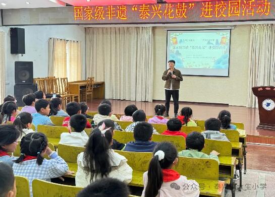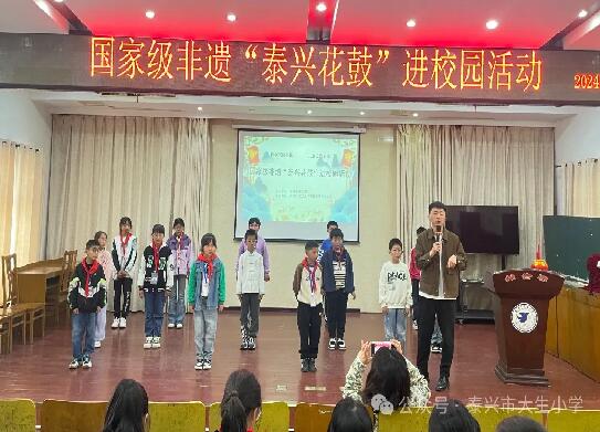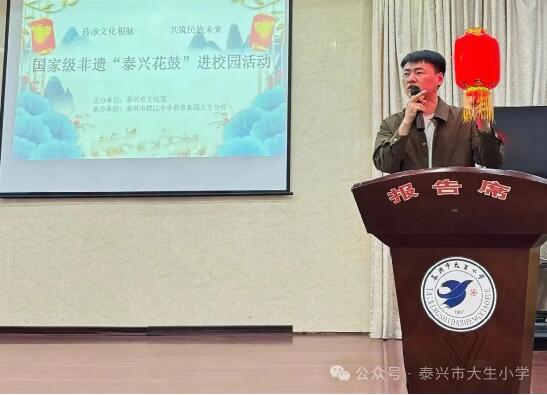 知花鼓 傳文化 “泰興花鼓”進校園活動由小主持人對泰興市文化館的專家——“泰興花鼓”第八代傳承人胡盛主任的介紹拉開序幕。