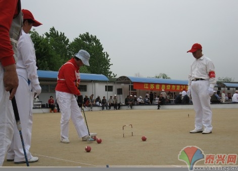 (記者 葉余華 通訊員 丁三友 攝)5月5日,江蘇省縣級市第36屆門球聯誼賽已進入循環決賽階段,22支代表隊比賽自始至終進行得十分緊張、激烈而又文明、和諧,球來球往,目不暇接,斗智斗勇,扣人心弦,惹人眼球,煞是好看。瞧!比賽現場,運動員各個精神煥發、球技嫻熟。左邊場地的運動員擊球進門得分,右邊場地的運動員則腳踏兩球,用木槌打閃擊球。