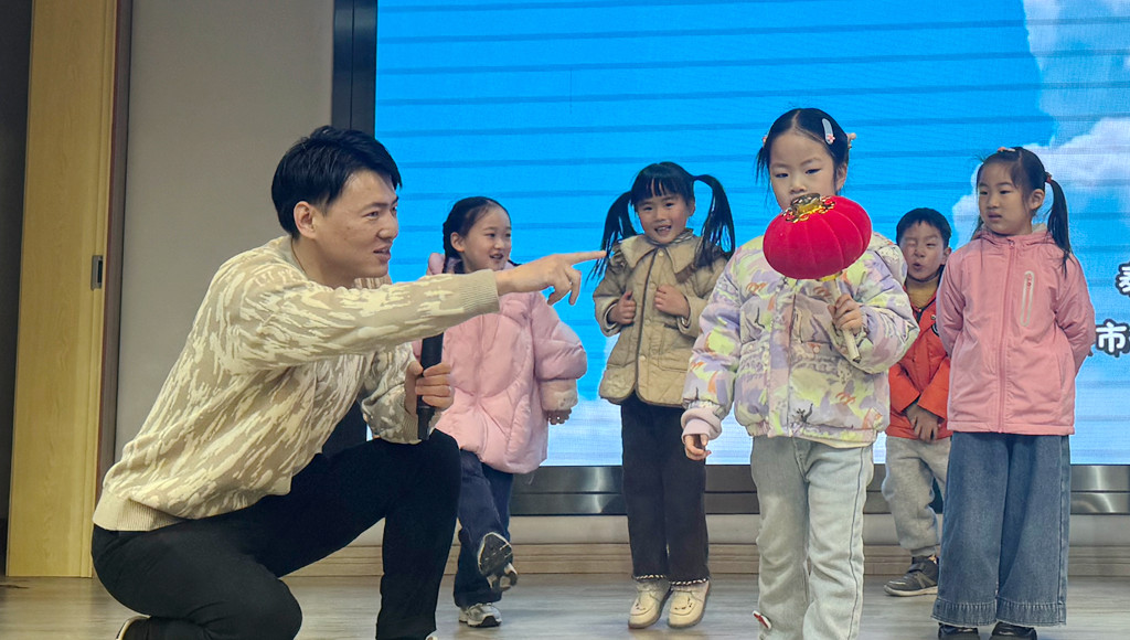非遺傳承人——胡盛,走進文江園,他用故事串聯泰興花鼓的歷史脈絡,講述了泰興花鼓的起源、發展以及表演技巧,并現場示范、教授“顛三步”“喜鵲登梅步”“四方步”等經典步伐。孩子們看得目不轉睛,躍躍欲試。胡盛老師耐心地蹲下身子,手把手指導孩子們調整姿勢。漸漸地,孩子們的動作從笨拙到流暢,會場里洋溢著歡聲笑語。