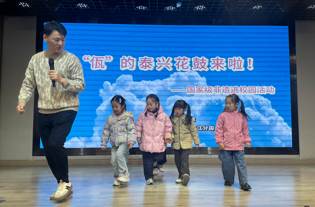 稚嫩的童聲應和著悠揚的旋律,飄動的衣角隨著跳躍的身影翻飛……今日,泰興市育紅幼兒園文江分園內,孩子們化身“小小傳承人”,踏著歡快的節奏,學習國家級非物質文化遺產——“泰興花鼓”。這場寓教于樂的“非遺啟蒙課”,讓傳統文化與童真童趣碰撞出絢爛火花。