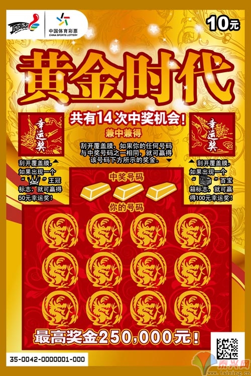 從金燦燦的票面來(lái)看,“黃金時(shí)代”可以說(shuō)是頂呱刮經(jīng)典的珠光寶氣系列票種的延續(xù),10元的面值,最高25萬(wàn)元的獎(jiǎng)金這些關(guān)鍵詞都是彩民再熟悉不過(guò)的了。從“三重鉆石”、“百寶箱”再到如今的“黃金時(shí)代”,頂呱刮的珠寶旋風(fēng)仍將逾加強(qiáng)勁。 “黃金時(shí)代”共有3個(gè)刮開(kāi)區(qū),最大的刮開(kāi)區(qū)延續(xù)了10元票的經(jīng)典數(shù)字匹配玩法,可有12次中獎(jiǎng)機(jī)會(huì),刮開(kāi)覆蓋膜,如果你的任何號(hào)碼與中獎(jiǎng)號(hào)碼之一相同,就可贏得該號(hào)碼下方所示的獎(jiǎng)金;而另外兩個(gè)刮開(kāi)區(qū)則是該票的幸運(yùn)獎(jiǎng)區(qū),刮開(kāi)覆蓋膜,如果出現(xiàn)王冠或百寶箱標(biāo)志,就可贏得相應(yīng)的幸運(yùn)獎(jiǎng)金。如果算上全部三個(gè)刮開(kāi)區(qū),“黃金時(shí)代”共有14次中獎(jiǎng)機(jī)會(huì),這顯然也是10元票種的一個(gè)全新升級(jí),相信會(huì)帶給彩民格外的驚喜體驗(yàn)。 支援災(zāi)區(qū)“大愛(ài)無(wú)疆”