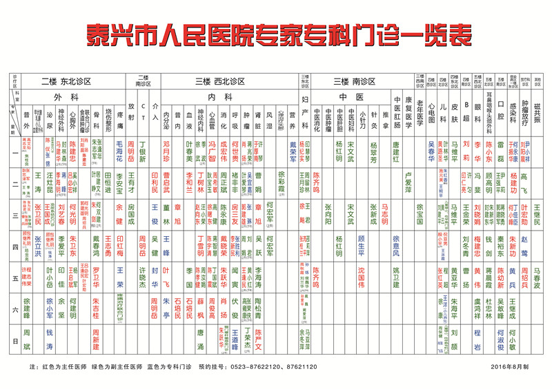 泰興市人民醫院專家專科門診一覽表