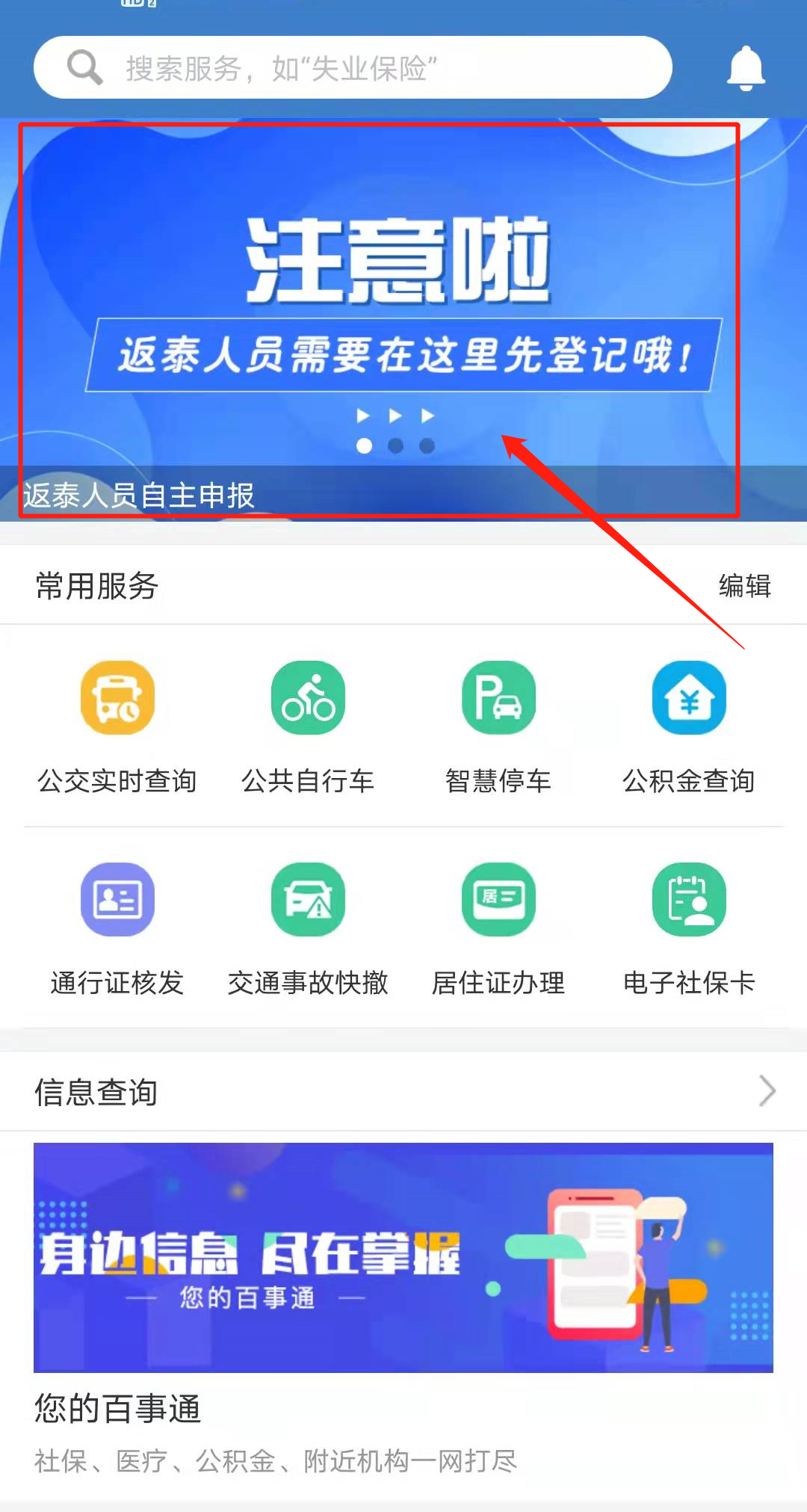 APP填報指南: 下載安裝完畢后,在首頁點擊“返泰人員自主申報”指示圖: