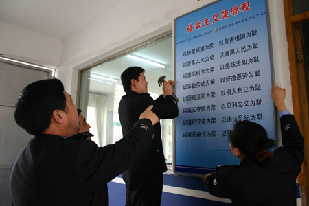 圖:該局濟川派出所將“八榮八恥”內(nèi)容制作成站牌,懸掛于派出所內(nèi)最醒目的位置,便于民警時時對照。(陸裕順  楊玉蘭攝報)