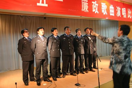 作為“五一警體周”活動(dòng)的一部分,4月24日晚,泰興市公安局結(jié)合社會(huì)主義榮辱觀教育,舉辦了慶“五一”廉政歌曲演唱比賽,從而正式拉開了該局今年“五一警體周”活動(dòng)的序幕。此次比賽有20多個(gè)單位、部門的140多名民警參加,比賽的優(yōu)勝單位將代表該局參加全市廉政歌曲演唱比賽。圖為市看守所民警正在演《公務(wù)員之歌》。(陸裕順)