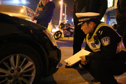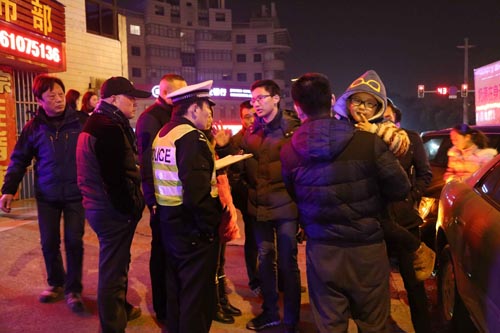 錢峰是泰興交警大隊事故處理中隊的一名民警,2016年1月1日正好輪到他值班,圖為他正在處理一起交通碰擦事故。據了解元月1日當天,錢峰和他的戰友們接到事故報警55起,而12月31日跨年的當天,接警76起。