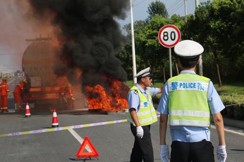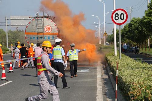 為深刻吸取江蘇德橋倉儲有限公司“4·22”火災事故教訓,著力解決危險化學品道路運輸安全工作中存在的突出問題,堅決防止發生重特大道路交通事故,切實保障人民群眾生命財產安全,7月21日,泰興公安交警大隊在泰興市悅達危險品運輸有限公司開展了由虹橋鎮綜治辦、中丹集團消防隊以及轄區新昌、泰華、太平洋危險品公司等多部門聯合舉辦的;返缆愤\輸泄漏事故應急救援演練。此次演練的內容設定為在S232省道,悅達危險品公司一輛滿載有危險化學品的槽罐車從專用停車場出發,行駛至S232-28km處被另一輛肇事貨車追尾,導致危險品槽罐車閥門受損,引發危險品泄漏的事故。事故發生后,虹橋交警中隊調動警力迅速對現場交通進行管制,同時立即向上級部門領導匯報,啟動應急聯動機制,調集相關聯動單位到場配合。消防處置力量到場后,按照泄漏事故處置要點通過偵查檢測、警戒疏散、生命救助和稀釋驅散等戰斗環節,在參戰聯動單位積極配合下,經過一個小時戰斗成功處置險情。