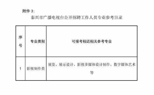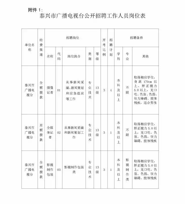 具體崗位及招聘條件等詳見《泰興市廣播電視臺公開招聘工作人員崗位表》(以下簡稱“崗位表”,附件1)。