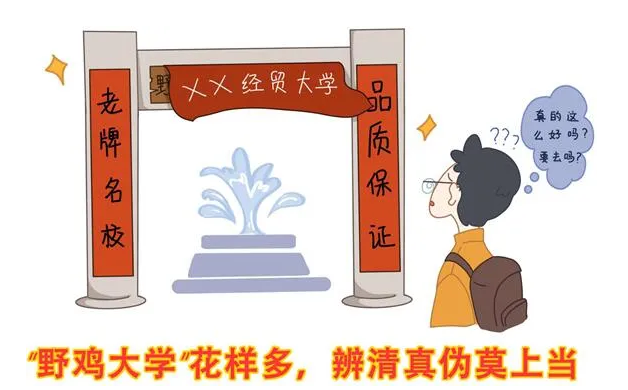 “野雞大學”也稱“虛假大學”“學店”,其以謀利為目的,通常采用與知名大學院校容易混淆的名稱,以混淆視聽的方式招收學生,亂發(fā)文憑。這些學校都是不具招生資格、沒有辦學資質(zhì)、涉嫌偽造售賣虛假學歷文憑證書、涉嫌非法招生或網(wǎng)絡詐騙的虛假大學。稍有不慎就有可能誤入其中,尤其是對于考試成績不太理想的考生,更應謹慎辨別。