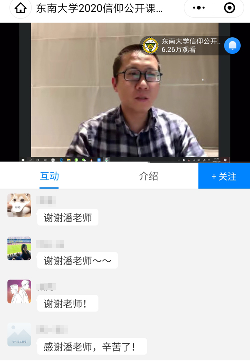 同樣是在3月8日婦女節(jié)這天,東南大學(xué)的師生們通過直播間看到了巾幗英雄江蘇支援湖北黃石醫(yī)療隊、醫(yī)療救治及專家組組長、東南大學(xué)附屬中大醫(yī)院副院長黃英姿發(fā)來的前線視頻,“感謝東南大學(xué)和社會各界對我們的關(guān)心和支持,我在黃石,一切安好!”同學(xué)們祝女神節(jié)日快樂的留言一次次刷屏。 這一次連線湖北的互動使東南大學(xué)師生們“親臨”一線,感受到了那場沒有硝煙的戰(zhàn)爭和醫(yī)護(hù)人員堅守崗位的奉獻(xiàn)。不僅在湖北一線,在南京,一大批醫(yī)護(hù)人員也同樣在堅守崗位,直播間連線了在后方堅守陣地的東南大學(xué)附屬中大醫(yī)院重癥醫(yī)學(xué)科黨支部書記黃力維和醫(yī)護(hù)人員們,黃力維在直播間帶領(lǐng)同學(xué)們參觀了中大醫(yī)院重癥醫(yī)學(xué)科的展覽,讓同學(xué)們感受到了這支“航母戰(zhàn)隊”在病床前的高超醫(yī)術(shù)和生活中的溫馨時刻。他們用實(shí)際行動踐行了“厚德精業(yè),敦行至善”的中大醫(yī)院精神和東南大學(xué)“止于至善”的意志品質(zhì)。“熱淚盈眶”“你們要保護(hù)好自己”“期待英雄凱旋”……這支東南大學(xué)附屬中大醫(yī)院重癥醫(yī)學(xué)科的“航母戰(zhàn)隊”讓直播間另一端的東大師生們?yōu)橹鸷澈透袆樱麄兗娂娏粞裕磉_(dá)敬意和振奮。 “親和、真實(shí)、感動”這場精彩的直播結(jié)束后,東南大學(xué)的師生們在朋友圈里這樣評價,更多的醫(yī)學(xué)生們更表示,這場直播圓了他們一個夢,這場“信仰公開課”的魅力和價值也正是如此,讓無數(shù)青年心中有信仰、腳下有力量。 |
