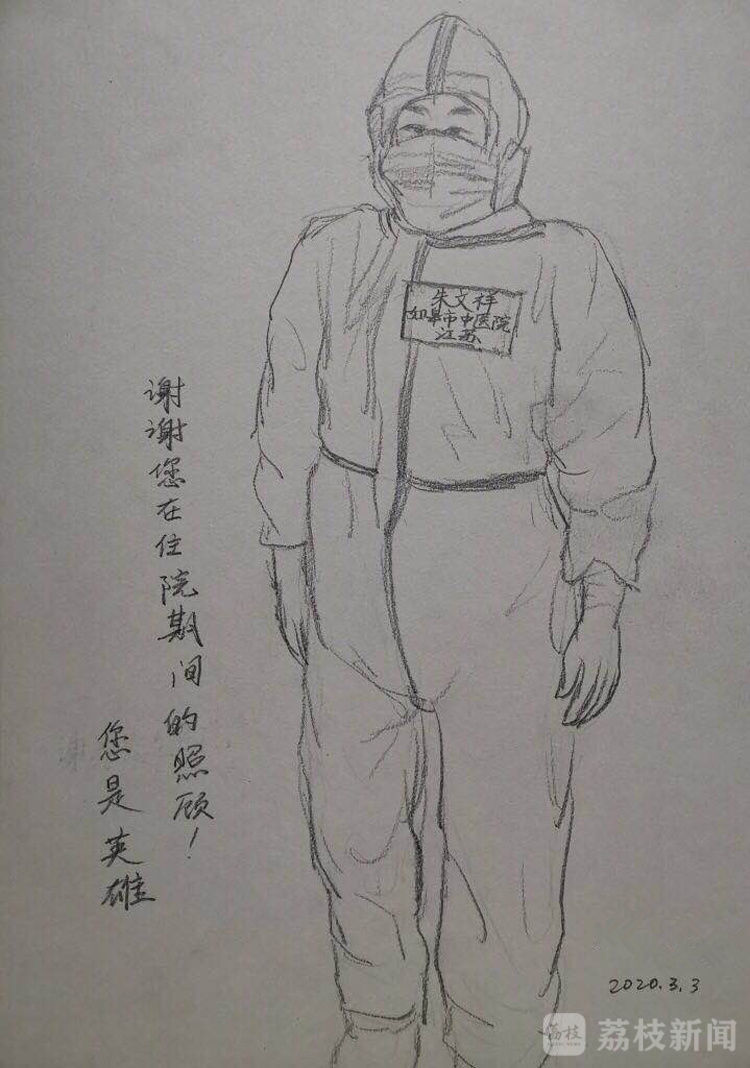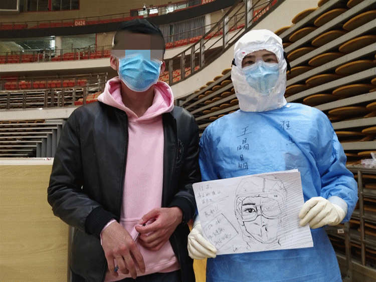 3月2日、3日,武漢體育中心方艙醫院迎來“出院潮”,連續兩天有超過100名患者出院。有的患者在出院前對醫務人員說:“等疫情結束,你們到武漢來玩,聯系我,我全包!”有的患者出院當天拿著紙筆來到醫務人員面前說:“我想畫張我心目中你的樣子。雖然我不知道防護服下你們的樣子,但是我永遠忘不了你們照顧病人時那溫柔的眼神!”