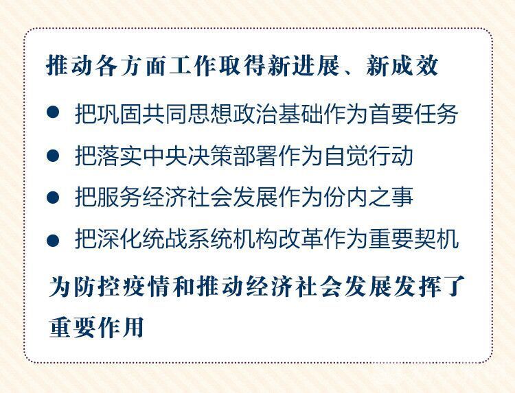 會(huì)議認(rèn)為,過去一年,全省統(tǒng)一戰(zhàn)線深入學(xué)習(xí)貫徹習(xí)近平總書記關(guān)于加強(qiáng)和改進(jìn)統(tǒng)一戰(zhàn)線工作的重要思想,把鞏固共同思想政治基礎(chǔ)作為首要任務(wù),把落實(shí)中央決策部署作為自覺行動(dòng),把服務(wù)經(jīng)濟(jì)社會(huì)發(fā)展作為份內(nèi)之事,把深化統(tǒng)戰(zhàn)系統(tǒng)機(jī)構(gòu)改革作為重要契機(jī),圍繞中心、服務(wù)大局、主動(dòng)作為,推動(dòng)各方面工作取得新進(jìn)展、新成效,呈現(xiàn)出開拓進(jìn)取、團(tuán)結(jié)和諧的良好局面。尤其值得肯定的是,新冠肺炎疫情發(fā)生以來,全省統(tǒng)一戰(zhàn)線積極響應(yīng)號(hào)召,迅速行動(dòng)起來,發(fā)揮特色優(yōu)勢(shì),踴躍捐款捐物,廣泛凝聚攜手同心戰(zhàn)“疫”情、同舟共濟(jì)克時(shí)艱的統(tǒng)戰(zhàn)力量,為防控疫情和推動(dòng)經(jīng)濟(jì)社會(huì)發(fā)展發(fā)揮了重要作用。