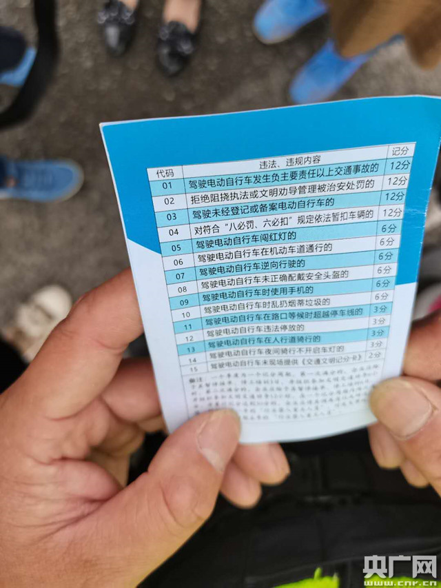 扣分細(xì)則(央廣網(wǎng)發(fā) 通訊員供圖) 5月10日上午10點(diǎn)30分,正值外賣送餐高峰,在舟山新城定沈路合興路路口附近,舟山市公安局交警支隊(duì)新城大隊(duì)聯(lián)合新城城管、新城特警中隊(duì),對(duì)過往外賣快遞騎手進(jìn)行逐一檢查。一個(gè)小時(shí),過車百余輛,有10余輛存在不同程度的問題,包括文明記分卡信息不全、騎行時(shí)接打手機(jī)、逆向行駛等行為。 檢查中,因?yàn)橥泿拿饔浄挚ǎ缊F(tuán)外賣騎手王某直接被扣2分。他告訴記者,這樣的新規(guī),對(duì)所有路上的交通參與者都好,絕對(duì)支持,以后工作出行,一定記得帶上記分卡。 而餓了么外賣騎手李某因?yàn)榫懿慌浜犀F(xiàn)場(chǎng)民警的檢查,同時(shí)不配合企業(yè)負(fù)責(zé)人的現(xiàn)場(chǎng)勸導(dǎo),被扣12分。新城交警大隊(duì)勾山中隊(duì)副中隊(duì)長(zhǎng)劉軍杰介紹,根據(jù)規(guī)定,記分周期為一個(gè)季度,一年四個(gè)周期。記分分值為對(duì)應(yīng)騎手在道路上發(fā)生交通違法行為的嚴(yán)重和危害程度所設(shè)定,共計(jì)15項(xiàng),其中阻撓執(zhí)法等一次記12分的4項(xiàng),闖紅燈等一次記6分的6項(xiàng),違法停車等記3分的4項(xiàng)及1分1項(xiàng)。對(duì)一個(gè)周期內(nèi)單次或累計(jì)記分達(dá)12分的騎手,由公安交警部門抄告通知書,企業(yè)予以暫停接單、停工培訓(xùn),并組織參加文明交通勸導(dǎo);一個(gè)周期內(nèi)記滿30分的,騎手將被調(diào)離崗位或辭退處理,納入為期一年的“行業(yè)禁入重點(diǎn)人員”;發(fā)生事故后逃逸的,五年“禁入”。