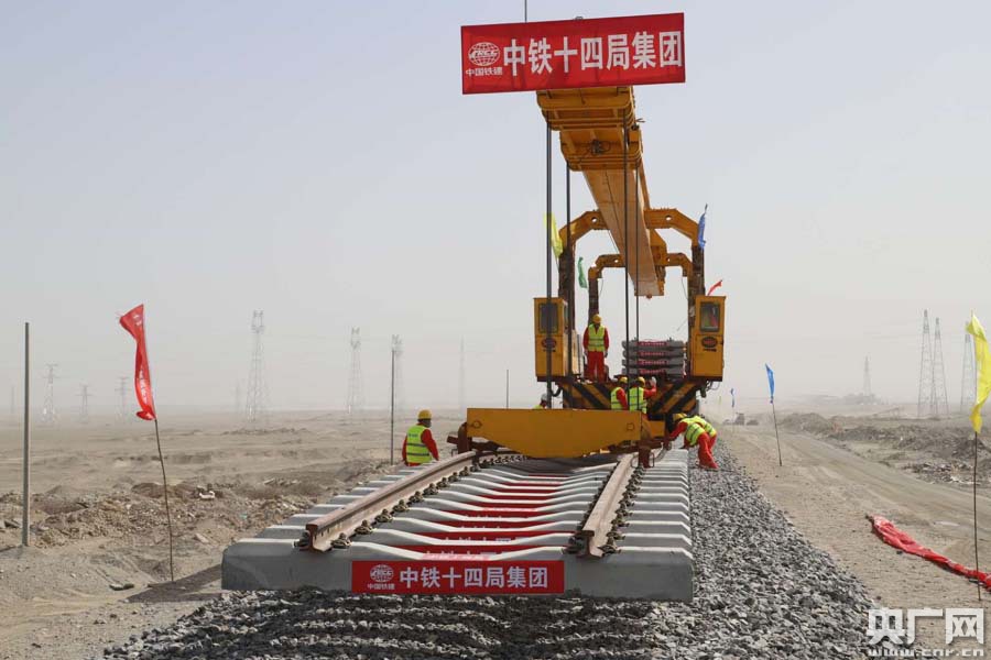 新疆和若鐵路開始鋪軌(央廣網發 關博 胡志剛 攝) 央廣網若羌5月10日消息(記者吳卓勝 通訊員穆志鵬 姜大偉)今天11時,在和(田)至若(羌)鐵路若羌站施工現場,隨著一組25米軌排緩緩落下,標志著和若鐵路正式進入鋪軌階段,新疆環塔里木鐵路最后一段建設取得重大進展。 和若鐵路位于新疆和田地區和巴音郭楞蒙古自治州境內,線路全長825.476公里,為客貨共用單線鐵路,設計時速120公里。建成通車后將與在建的格庫鐵路組成新疆第三條東西向交通大動脈、南部大通道。 據了解,該條鐵路位于塔克拉瑪干沙漠南緣,鐵路沿線屬干旱荒漠性氣候,風沙天氣居多且晝夜溫差大,沿線460余公里均為無人區,建設所需軌料運輸距離長達700多公里,給施工建設帶來困難。