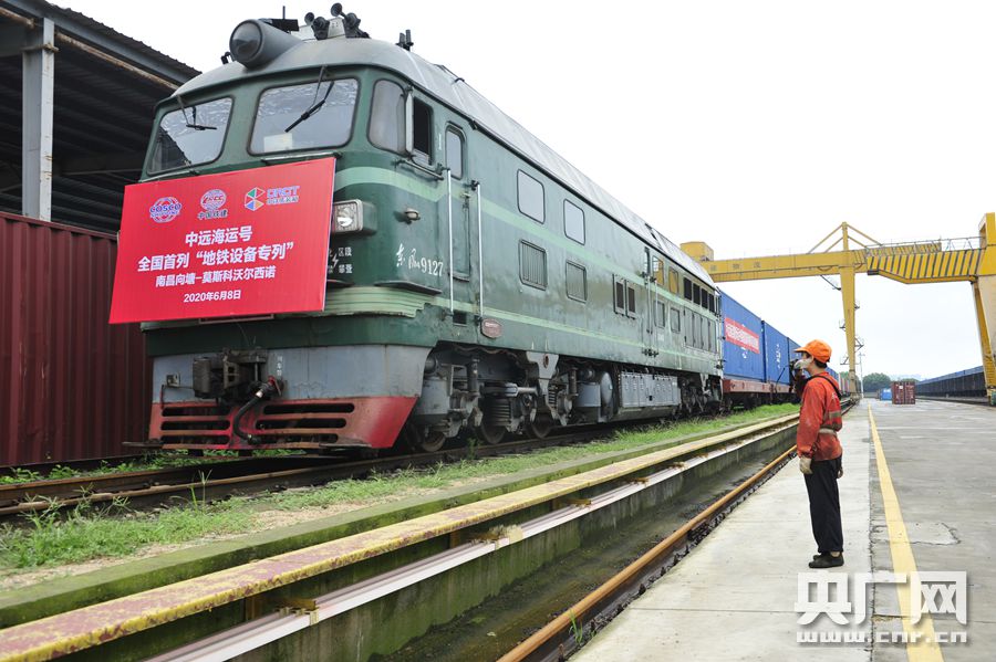 “地鐵施工設備專列”中歐班列從南昌向塘國際陸港發出(央廣網發 通訊員供圖) 央廣網南昌6月8日消息(記者謝元森 通訊員李慳)6月8日,一趟滿載著大型地鐵地下施工專用設備的中歐班列專列從南昌向塘國際陸港駛向俄羅斯莫斯科,這是全國開行的首趟地鐵施工設備專列,也是南昌向塘國際陸港繼食品專列、防疫物資專列之后又一定制專列。
