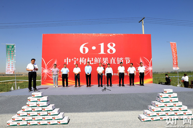 火紅枸杞映襯中的6.18活動(央廣網發 通訊員張潔龍 攝) 央廣網銀川6月18日消息(記者徐升)今天,“6·18”中寧枸杞鮮果直銷節在寧夏中寧縣啟動。中寧縣委書記陳宏做客線上直播間與主持人共同推介中寧枸杞,超過70多萬網友進入直播間觀看了線上直播活動。