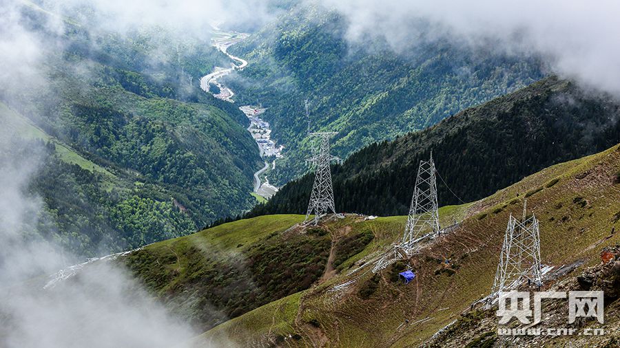 5月8日,在甘孜瀘定磨崗嶺村,建設者提前完成了豎立鐵塔的工作任務(央廣網發 通訊員供圖)