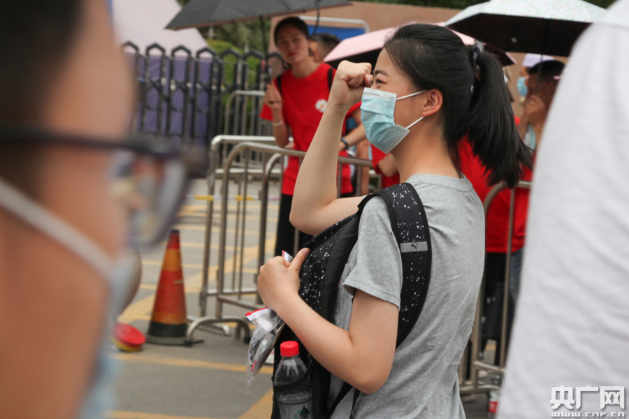 老師為考生加油(總臺(tái)央廣記者 徐升 攝) 受疫情影響,2020年全國高考較往年推遲一個(gè)月舉行。為做好疫情防控常態(tài)化下國家教育考試防疫工作,寧夏所有考場實(shí)現(xiàn)了“遠(yuǎn)程實(shí)時(shí)監(jiān)控和巡查”“防范無線電信號作弊”“人臉識別”“考生入場安檢”“身體健康監(jiān)測”5項(xiàng)工作全覆蓋。
