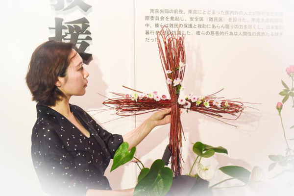 “花語”訴和平。(蔡美婷 攝) 上午9點,活動在紀念館史料陳列廳“人道主義救援”展區舉行。展區前設著幾張花臺,花臺上,破碎的瓦片覆蓋著碧綠的苔蘚,在瓦片的縫隙中,白掌參差錯落,綠松傲然挺立,用紅端木制作的“紅十字”裝置肅立在展區入口。儀式中,侵華日軍南京大屠殺遇難同胞紀念館館長張建軍將一束粉色的和平月季置于盆景中,整部象征和平的花語作品宣告完成。