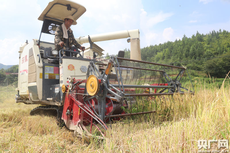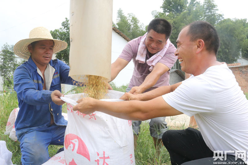 稻谷裝袋(央廣網(wǎng)發(fā) 通訊員梁紫微 攝) “往年我們自己種植的時候,都是靠天吃飯,晴時旱,雨時澇,收成非常不穩(wěn)定,現(xiàn)在流轉(zhuǎn)給周漢君統(tǒng)一種植,到了收割的季節(jié),只要過來按照約定的田租稱稻谷,不用擔(dān)心稻谷的收成,省時省力又安心”。村民彭阿姨說道。 收割機(jī)正在作業(yè),據(jù)初步統(tǒng)計,這些一次收割的再生稻,畝產(chǎn)約800斤,整個300余畝收割下來,產(chǎn)量預(yù)計在26-28萬斤之間。收割的稻谷一部分用來以谷代租付給村民外,已經(jīng)有10余戶鄉(xiāng)里鄉(xiāng)外的釀酒農(nóng)戶前來收購。“有來收割現(xiàn)場購買的,就直接賣掉,剩下暫未賣出去的,曬好后放在倉庫里,通過互聯(lián)網(wǎng)聯(lián)系用糧戶收購,我自己養(yǎng)殖的雞鴨、生豬也能消化掉一部分,沒想到第一次種植,就獲得了豐收。”面對記者采訪,周漢君開心的說道。