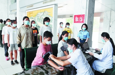 8月21日下午,記者來到南京市國防教育訓練基地,看到體檢現場全部采用封閉模式。待檢女青年分組進入各項目考核室,進行血壓、體能測試、心理測試等檢測。