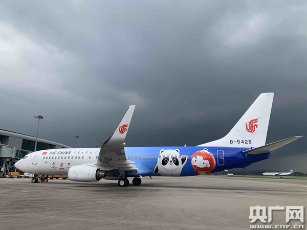 冬奧主題彩繪飛機“冬奧冰雪號”首次亮相廣州(央廣記者周羽 攝) 國航“冬奧冰雪號”主題彩繪飛機得名源于北京2022年冬奧會和冬殘奧會吉祥物“冰墩墩”和“雪容融”,各取首字“冰”“雪”既體現了冬奧會冰雪運動特點,又緊扣“純潔的冰雪激情的約會”美好愿景。澄澈的漸變藍和通透的白色覆蓋機身,猶如藍天與冰雪交相輝映,充滿美好寓意的“冰墩墩”“雪容融”躍然機上。