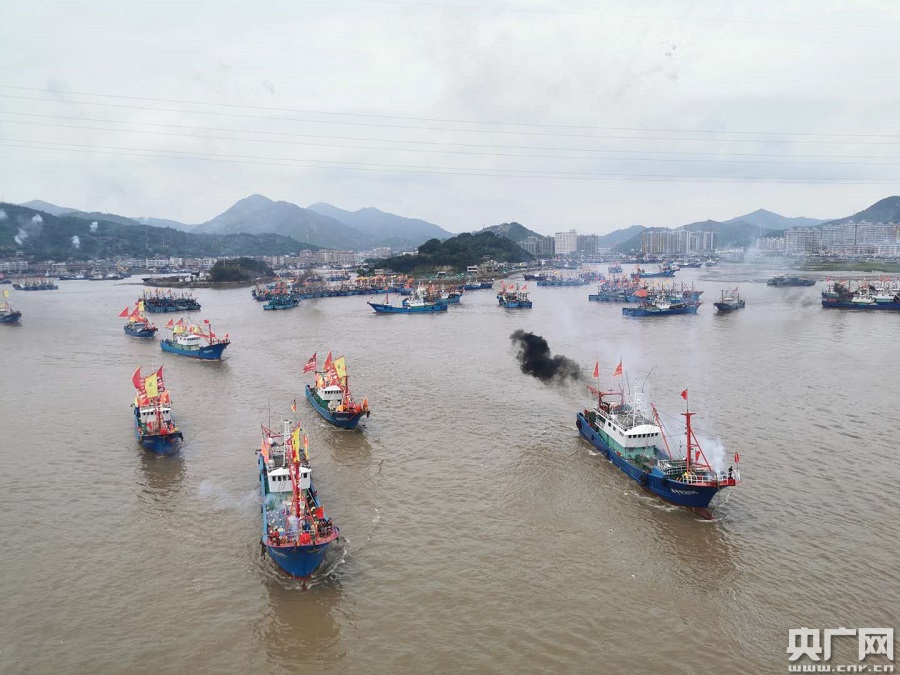 石浦漁港千舟競發(fā)(央廣網(wǎng)記者 杜金明 攝) 央廣網(wǎng)寧波9月16日消息(記者曹美麗 杜金明 通訊員俞莉 陳光曙)55歲的寧波市象山縣石浦鎮(zhèn)漁民陳建勇今天(16日)的中午飯多了兩道菜:炒年糕和紅燒黃花魚。“今天是開漁的日子,我們漁民有這個(gè)傳統(tǒng),希望滿載而歸,一年更比一年高。” 陳建勇說。 當(dāng)天中午12點(diǎn),東海為期四個(gè)半月的伏季休漁期結(jié)束,寧波市象山縣1000多艘漁船駛出石浦漁港,直奔東海。 喜迎東海開漁,上午11:30,中國農(nóng)民豐收節(jié)系列活動(dòng)暨第二十三屆中國(象山)開漁節(jié)開船儀式在石浦港舉行。一曲《龍騰四海》拉開了儀式的序幕。漁家漢子擂起漁家燈鼓,漁家女子揮舞著長綢扇,他們用這種方式為出海的漁民兄弟祈福壯行。 隨后,大家一起端起酒碗,向即將遠(yuǎn)航的漁民兄弟壯行,祝愿他們魚蝦滿倉,幸福安康。兩位飽經(jīng)風(fēng)霜的老漁民帶領(lǐng)漁姑、漁嫂,向后生輩漁老大大聲喊道:“后方的父老鄉(xiāng)親希望你們柯魚柯得前艙滿、后艙滿!”伴隨著禮炮聲,漁民“一帆風(fēng)順”“魚蝦滿艙”的吶喊聲,一口壯行酒入喉,千艘漁船首尾相接,直奔東海。