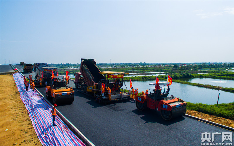 海陵島大橋今年12月建成通車(央廣網發 通訊員供圖) 此前于9月25日,項目順利完成了下面層試驗段的攤鋪。瀝青路面下面層試驗段定在陽江港互通連接線,全長約600m,這一試驗段攤鋪完成,加快了互通主線全封閉施工進程,為項目年底建成通車奠定了基礎。 海陵島大橋項目位于廣東省陽江市西南部,路線起于陽江高新區群利圍,順接陽陽高速公路,路線向南跨越平岡海堤與海陵灣水域后,南達陽江市海陵島。項目主線全長9.232公里,路基寬度26米,設計速度100公里/小時,按雙向四車道高速公路標準設計。設特大橋1座、大橋4座、中小橋4座,涵洞通道19道;設陽江港互通立交1處、終點平面交叉1處。