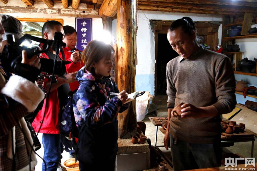 記者在香格里拉市尼西鄉湯滿村湯堆片區黑陶作坊采訪(央廣網記者張雷 攝) 當晚,采訪團抵達迪慶州首府香格里拉市,參觀有“月光城”之稱的獨克宗古城。 獨克宗古城是一座有1300多年歷史的古城,也是我國保存得最好最大的藏族民居群落。歷史上,這里曾是滇藏茶馬古道的樞紐及滇、川、藏物資中轉和文化、經濟交流中心,現在是蜚聲海內外的旅游目的地。