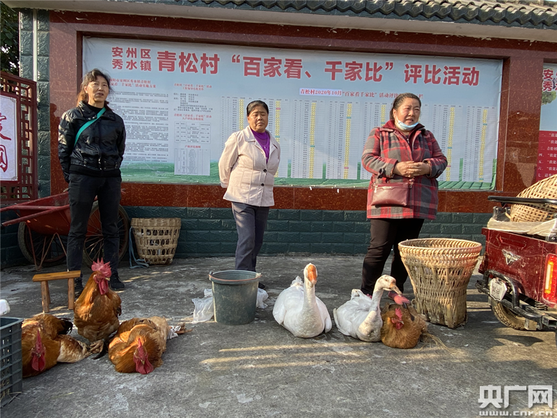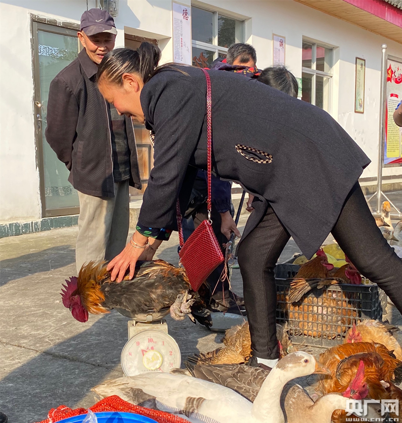 青松村扶貧趕集日(央廣網(wǎng)記者 王穎 攝) 央廣網(wǎng)綿陽(yáng)11月8日消息(記者王穎)在四川綿陽(yáng)安州區(qū)秀水鎮(zhèn)青松村每月的“扶貧趕集日”上,村委會(huì)的大院里一派熱鬧的景象。村民們帶著自家種植養(yǎng)殖的農(nóng)作物和家禽來(lái)趕集,大院里地上各自成攤,打圈擺著五谷、各類(lèi)蔬菜、家禽和活魚(yú),村民們說(shuō)笑聊天,雞鴨鵝唱起“和聲”。院子里不時(shí)的走進(jìn)購(gòu)物的人群,這些人購(gòu)物有個(gè)特點(diǎn),一次購(gòu)買(mǎi)量都比較大。不到一個(gè)小時(shí)的時(shí)間里,多位村民攤位上的農(nóng)副產(chǎn)品就銷(xiāo)售一空。青松村第一書(shū)記羅歡說(shuō),“像這樣一次趕集,一戶(hù)村民家的家禽起碼可以給他們帶來(lái)六七百元的收入,蔬菜能夠帶來(lái)兩三百的收入。”這個(gè)扶貧趕集日深得村民的喜歡,每到趕集日村里有一種過(guò)節(jié)般的喜悅和熱鬧的氣氛。