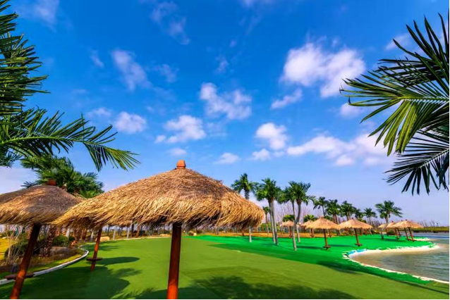 江海文化景觀大道 “運氣好的話,你在這里可以看到三水交匯的奇觀;對面可以看到崇明島,這里也是海上看日出的網(wǎng)紅打卡地。”站在“江之尾,海之頭”一個石碑前,啟東圓陀角旅游度假區(qū)委會黨群局局長龔紅宇將手指向石碑45度方向說,“我們度假區(qū)最大的資源特色,就是它既靠江也靠海,這里是長江入海口,然后以長江為界限,北邊是黃海,南邊是東海,度假區(qū)的江堤和海岸形成一個角,三水交匯的地方像一個圓陀角,所以取名為圓陀角旅游度假區(qū)。” 圓陀角旅游度假區(qū)是啟東重點開發(fā)、打造的又一個以文旅為特色的旅游度假區(qū),度假區(qū)里引進了恒大海上威尼斯項目和新湖長江公園項目。恒大海上威尼斯項目總占地面積9000多畝,規(guī)劃打造一個集酒店住宿、會議會展、文化娛樂、體育運動、養(yǎng)生保健以及度假人居等功能于一體的大型濱海度假綜合體。截至目前,該項目已累計完成投資200多億元,威尼斯酒店、國際會議中心、飲食中心、運動中心、兒童歡樂中心等九大中心以及四星級酒店、美食一條街等旅游設(shè)施已建成并對外開放。依托濱江臨海的區(qū)位優(yōu)勢和獨特的江海旅游資源,恒大海上威尼斯已成為長三角地區(qū)一個新興的旅游度假目的地。新湖長江公園整體項目還在火熱建設(shè)中,但郁金香花海等景點已經(jīng)對外開放。