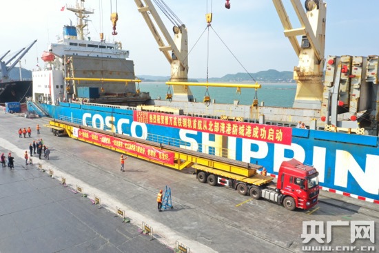 工作人員在吊裝鋼軌裝船(央廣網發 通訊員陳潔 攝) 經攀鋼、鞍鋼國貿攀枝花公司、北部灣港集團公司等五家公司與鐵路部門共同商定,制定了將100米鋼軌通過鐵路運輸到防城港,再切割成50米裝船運往印尼的運輸方案。因為100米鋼軌對運輸的平板車有特別的要求,為解決運輸難題,鐵路部門緊急調度專用平板車并進行加固改造,確保了這批鋼軌的順利運輸到港。 防城港作為我國西部第一大港,是國內各類礦石、建材及煤炭等戰略物資的重要中轉基地,也是攀鋼的重要進出口貿易通道。攀鋼生產鋼軌所需原材料鐵礦石從南非等國采購后,通過海運運輸到防城港接續鐵路運抵四川基地,雅萬高鐵鋼軌也通過鐵海聯運的方式在防城港中轉出口印尼。