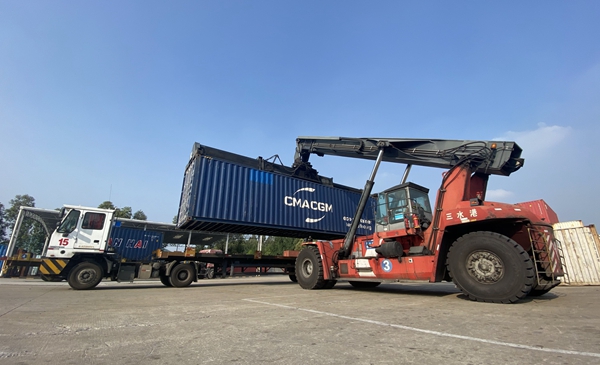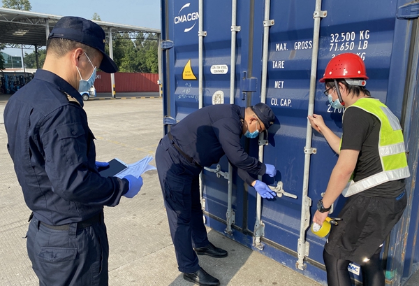 圖為廣州海關所屬佛山海關駐三水辦事處關員對退運固體廢物進行核對箱體和加封海關關封 (央廣網發 賴玨冰攝)