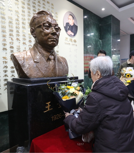 王適存夫人向雕像獻花。(唐宇明 攝) 當天上午,“中國直升機學術泰斗”王適存教授雕像也在南航校園內揭幕。王適存教授是中國直升機技術的先驅,中國直升機專業的奠基者,國際直升機界著名專家。他60年代初建立的“直升機旋翼廣義渦流理論”,被國際直升機界命名為“王適存渦流理論”,迄今仍被國際直升機界引用。他倡導自行研制的輕型直升機“延安二號”1975年試飛成功,是中國第一架自行設計、試飛成功的直升機。 已經94歲高齡王適存教授夫人王韞明來到儀式現場,她表示:“王適存一生的追求就是發展我國的直升機事業。直升機不管在軍事上還是在交通方面,都有著十分廣泛的運用,所以他非常希望能把直升機事業一代一代的傳下去。‘讓我們直升機專業的學生都有機會坐直升機到天上去轉一轉’,這是他一直以來的夢想。” 作為學生代表,吳希明深切緬懷了王適存教授:“當時,中國直升機事業還未完全起步,但王老師對直升機事業的熱情和未來發展的期望對我影響深刻,也讓我從心底熱愛這個專業。”