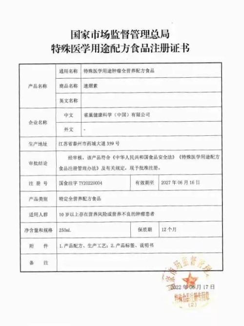 近日,經(jīng)國(guó)家市場(chǎng)監(jiān)管總局審批,泰州醫(yī)藥高新區(qū)(高港區(qū))入駐企業(yè)雀巢健康科學(xué)(中國(guó))有限公司研發(fā)的液態(tài)產(chǎn)品“速熠素”獲得到全國(guó)首張?zhí)厥忉t(yī)學(xué)用途腫瘤特定全營(yíng)養(yǎng)配方食品注冊(cè)證書(shū)。