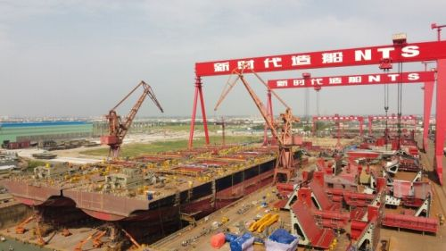 記者在新時(shí)代造船公司采訪時(shí),整個(gè)碼頭呈現(xiàn)一片熱火朝天的繁忙景象。“這是50萬(wàn)噸級(jí)船塢,有4艘21萬(wàn)噸LNG雙燃料散貨船在同時(shí)建造。前方3號(hào)碼頭,有5艘21萬(wàn)噸LNG雙燃料散貨船正在舾裝。”公司項(xiàng)目經(jīng)理劉明鋒介紹,企業(yè)3座大型船塢和3個(gè)舾裝碼頭目前全部滿負(fù)荷運(yùn)轉(zhuǎn),生產(chǎn)訂單已經(jīng)排至2026年。