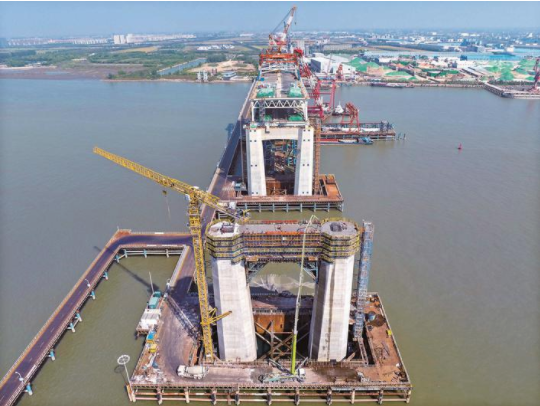 自2020年10月30日常泰長江大橋主航道橋下部結構首次施工,即首根主橋水上鉆孔灌注樁啟動以來,該公司建設團隊先后克服了多墩大型基礎先圍堰后樁法及先樁后圍堰法同步施工、大體積圍堰封底混凝土澆筑、大尺寸墩柱及橫梁施工的技術及生產組織難題,順利完成了常泰長江大橋泰興側水上主墩下部結構全部施工。