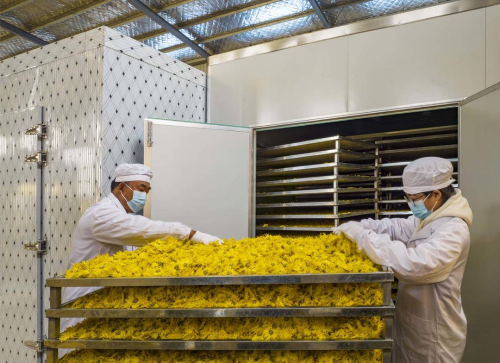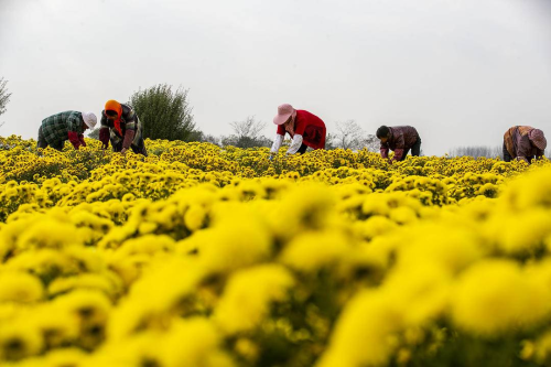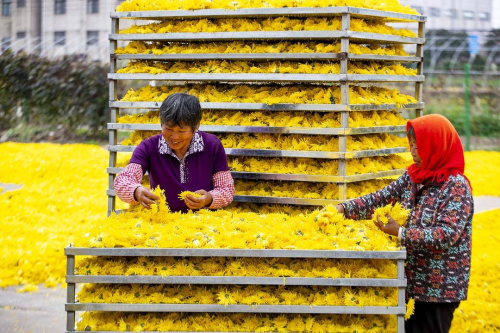 今年夏季,當地農民在收獲油菜后種植了450畝的婺源皇菊和金絲皇菊。村民們穿梭在“花海”之中,趁著晴好天氣采摘成熟的花朵,再進行烘烤、銷售,田間地頭一派繁忙的豐收景象。