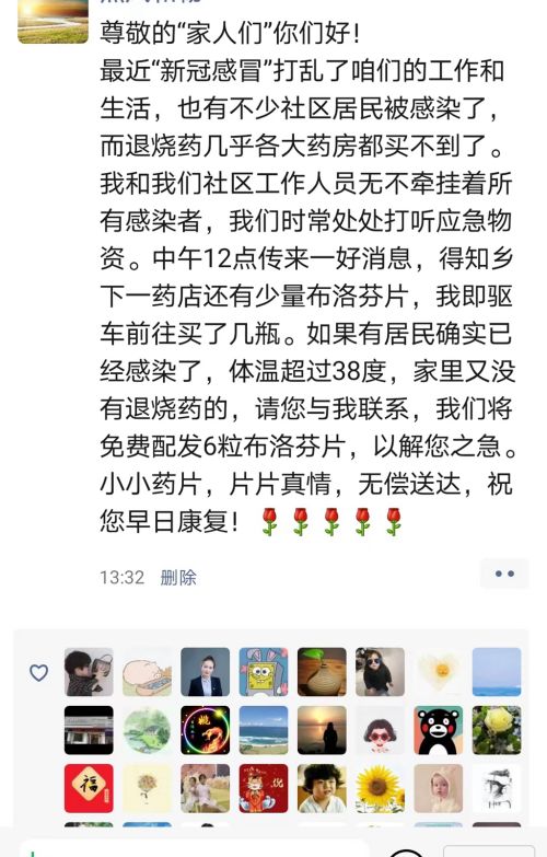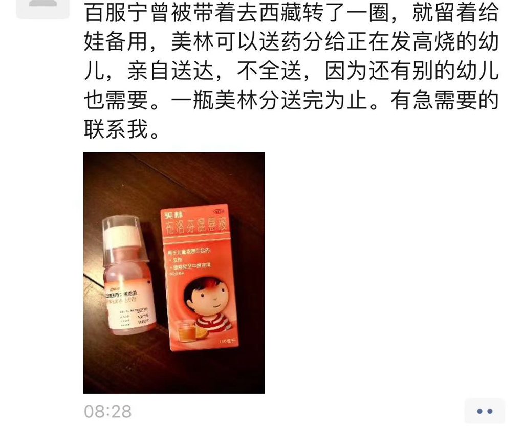 “百服寧曾被帶著去西藏轉了一圈,就留著給娃備用,美林可以送藥分給正在發高燒有需要的幼兒,不全送,因為還有別的幼兒也需要。一瓶美林分送完為止。有急需要的聯系我。”12月19日上午,市民朱紅在微信朋友圈發布了一條藥品“共享”信息。上午11時許,市民陳女士(化名)便聯系上朱紅,表示家中有人需要幾粒布洛芬。了解情況后,朱紅和陳女士約定好地點,并把4顆布洛芬藥片包裝好,再放在約定地點的花壇上,陳女士取完藥后再離開,全程保持無接觸狀態。