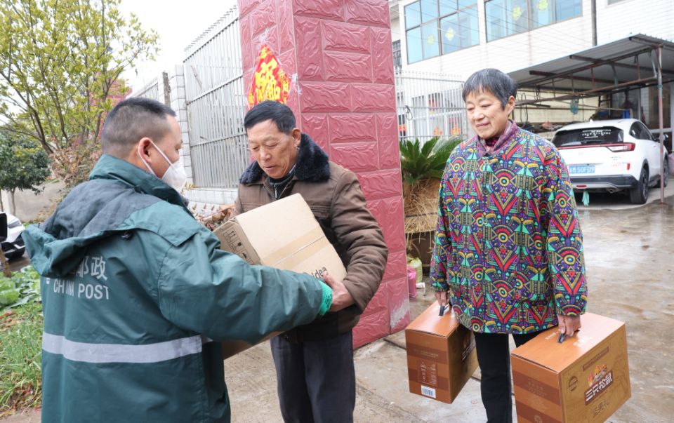 1月23日上午11:05,江蘇省靖江市東興鎮旺稼村村民姚繼發,在家門口喜滋滋地從郵遞員陳進手里拿到緊急添購的年貨。從向“年貨快閃店”打電話訂購,到郵遞員配送上門,姚大爺只等待了20分鐘。