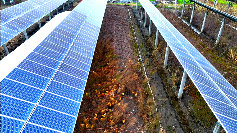 光伏電站除了發(fā)電還能做什么?在泰州市海陵區(qū)罡楊鎮(zhèn)純垛村,一排排光伏板依垛傍水,不斷提供著綠色能源,而兩千多只“飛雞”在光伏板下自由生長(zhǎng),成為當(dāng)?shù)氐奶厣r(nóng)產(chǎn)品。