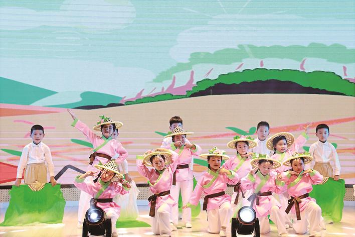 魯迅先生筆下的百草園,一花一木皆為玩伴,風吟雪落皆是童趣,讓人神往。寺巷幼兒園利用得天獨厚的地理資源、人文資源、自然資源打造了屬于孩子們的“百草園”。孩子們親手種下近百種中草藥,結合二十四節氣傳統文化打造出中草藥園、中草藥博物館、農耕文化博物館。舞臺上,孩子們通過音詩畫的形式,帶領大家來到校園百草園,認識紫蘇、蒲公英、板藍根、杜仲、紫菀、鐵線蓮等各種中藥材。