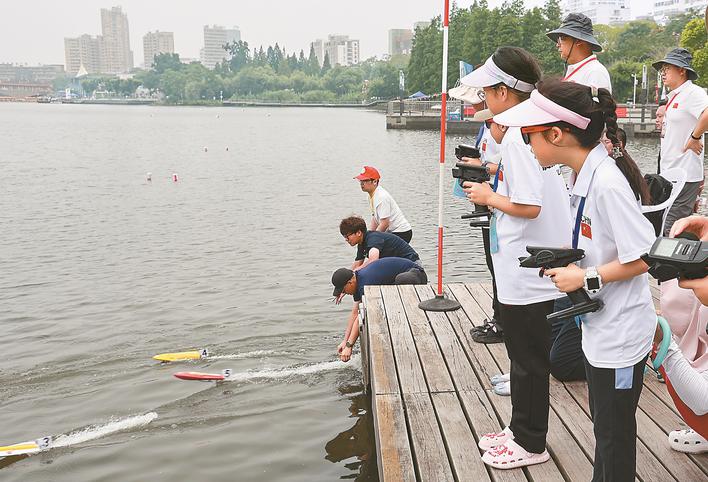 7月21日上午,在泰州市鳳城河雙擁廣場親水平臺水域,只見英姿颯爽的少年們憑借熟練的操控技巧,一艘艘模型船艇在水面上風馳電掣,演繹著水上的“速度與激情”。這是2023年“絲路信使杯”江蘇省青少年航海模型錦標賽的現場。