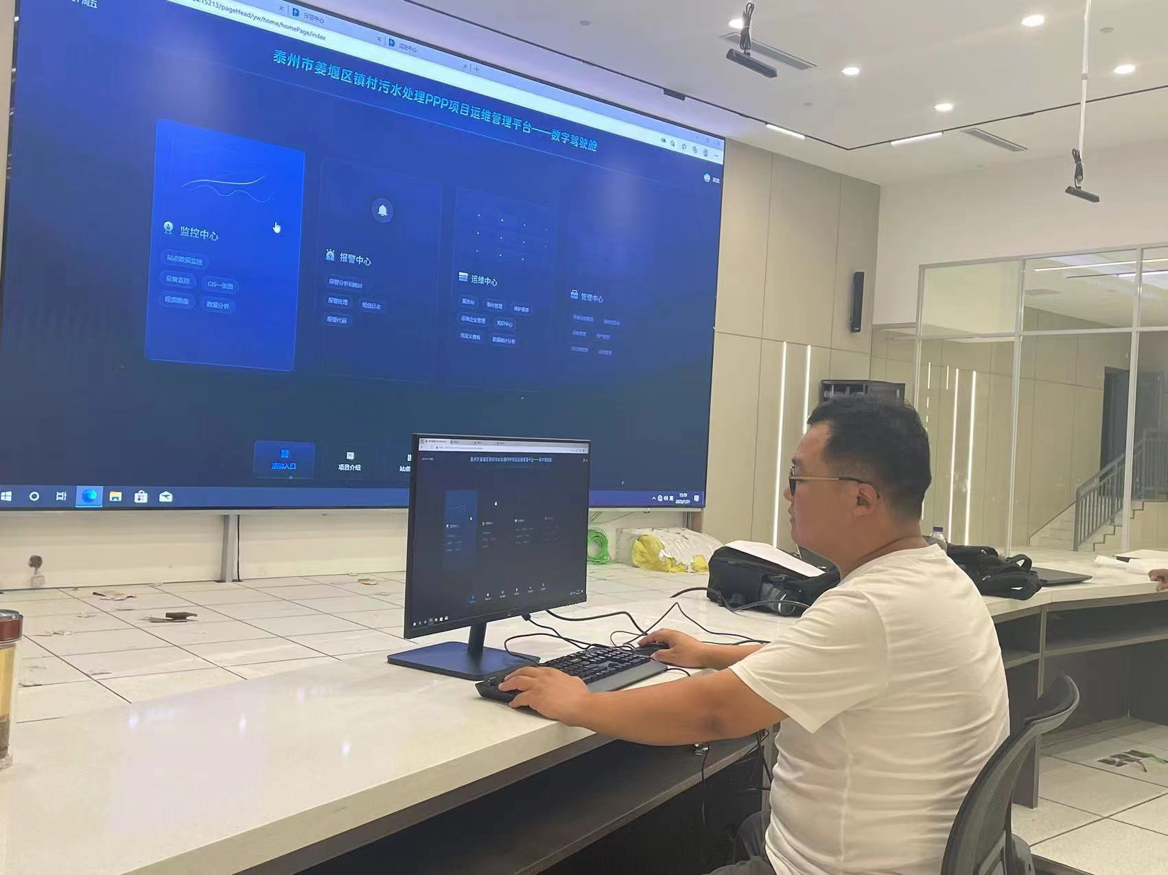 近日,走進(jìn)泰州市姜堰區(qū)三水大道88號(hào)文體中心三樓,環(huán)境治理工作人員凌杰正在監(jiān)控大屏前,查看污水設(shè)備運(yùn)行情況。該處便是姜堰打造的鎮(zhèn)村污水處理PPP項(xiàng)目運(yùn)維中心。