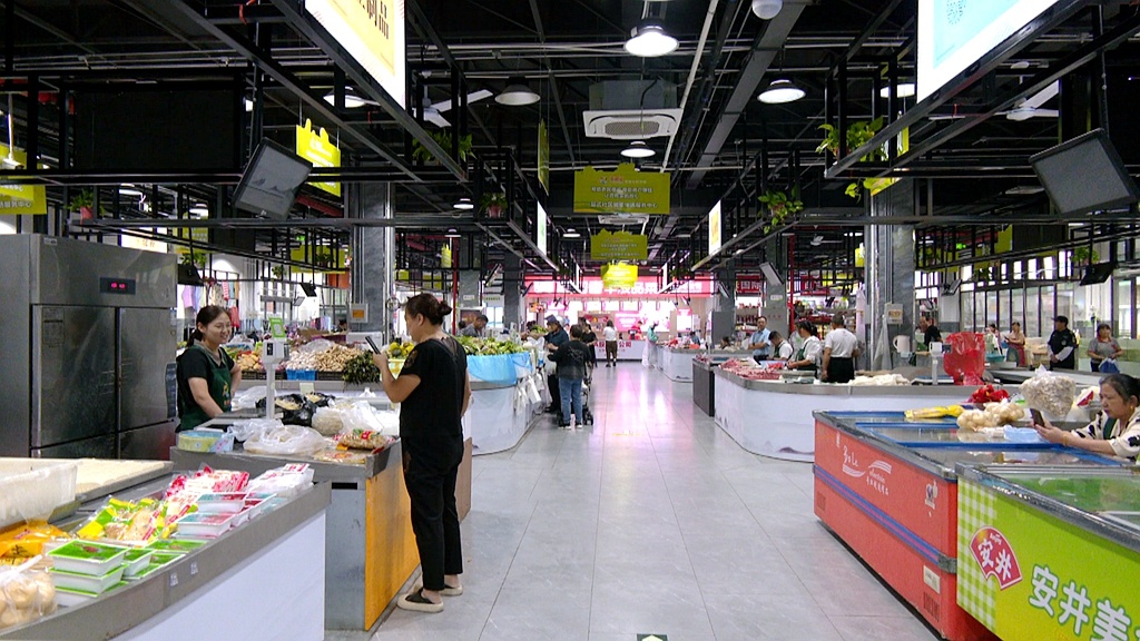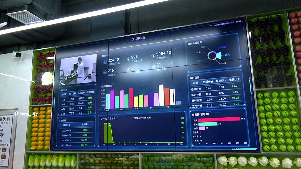 近日,記者來到泰興市文江印智慧生鮮市場,位于菜場入口處的智慧管理總覽屏正實時顯示著市場客流量、交易數據以及農產品農藥殘留檢測數據等。據了解,該市場于今年7月建成運營,共設肉類、蔬菜、水產、貝類、水果、預制菜等攤位31個。市場內,干凈整潔、燈光明亮,正常開放的中央空調,給市民帶來清涼、舒適的購物體驗。“肉類、蔬菜類等食材,都很新鮮,品種也齊全。而且這兒的環境不錯,比較干凈。”市民陳智陽說。