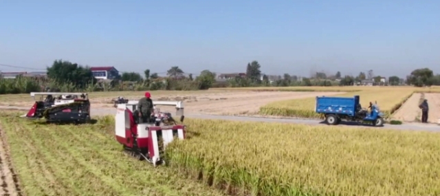 在姜堰區婁莊鎮寶成家庭種植農場的麥田里,農機手熟練地操作著收割機在金色的田野里來回穿梭,一串串飽滿的稻穗卷入收割機中,接著一粒粒稻子被收割機盡收“囊中”,切碎的秸稈從機尾排出,陣陣稻香也在空氣中彌漫開來。不一會兒,裝滿稻子的收割機駛到了田埂邊,村民們駕駛著拖拉機將稻子送到稻場。 在姜堰區三水街道井賢農場,大型收割機來回穿梭,發出隆隆的轟鳴聲,將沉甸甸的稻穗攬入“懷中”,轉眼間變成金燦燦的稻谷,田間一幅喜人的秋收圖景。收回的稻子隨即被轉移到運輸拖拉機上,直接運送至稻米烘干基地。烘干后,農戶們忙著裝袋、稱重。今年的水稻喜獲豐收,農場主姜井賢的喜悅之情溢于言表。 過去種植水稻大多靠人力和畜力,農民從種到收、從春到秋忙個不停。現今,科技進步、時代發展,農業機械化水平不斷提高,機械化收割既提高效率,又節約了成本,農民種地越來越輕松。 田間一派豐收景象,秋糧收購也刻不容緩,連日來,姜堰區地方儲備糧管理有限公司搶抓時間,周密部署,通過“早謀劃、早研判、早應對”, 確保收獲的糧食顆粒歸倉、儲存安全。此外,該公司還開放了糧庫的部分場地,供農戶們晾曬稻谷,暖心舉措緩解了農戶曬谷難題。 據了解,姜堰區今年的水稻種植面積43.66萬畝,預計11月8日基本收割結束,全區產量比去年增產7% 以上。
