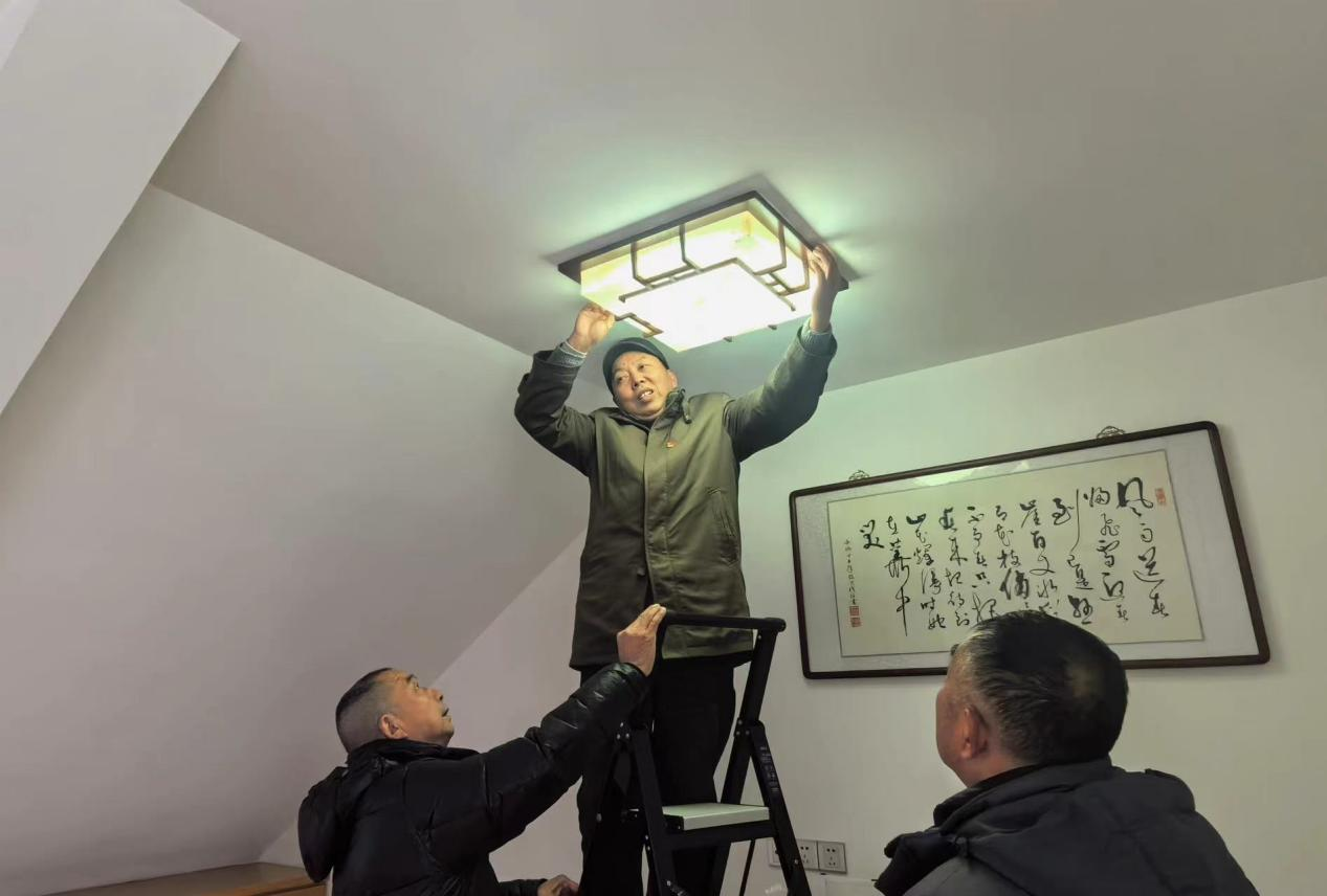 段成林簡單查看吊燈,發(fā)現(xiàn)線路沒問題,是燈年久老化。 我給你換個新的吧,LED 越用越亮。僅用10分鐘,新燈安裝完畢,開關(guān)一按,家里瞬間亮堂了。 “謝謝段師傅和這個團隊,每次一喊就到,不但不收錢,連個水都不喝!”說著,仲春紅濕了眼眶。 “喂,老段嗎?我家水管在漏水,有沒有空來看看?”大年三十上午,在辦公室剛坐下,段成林就接到了居民王躍群的電話。拿著工具包,段成林和幾名同伴立刻出了門,經(jīng)過檢查,發(fā)現(xiàn)是水管凍裂了,段成林又連忙回服務(wù)站拿來了材料。“水管、電燈這些基本材料我們?nèi)粘6紓湓谥驹刚荆@樣可以隨時拿。” 忙活了一上午,中午回到服務(wù)站,幾人就拿泡面對付了一下。“年三十是最忙時候,我們雖然苦一點,但看到群眾露出笑臉,值得!” 過年期間,每天段成林團隊都要前往五六戶居民家中維修水電,他們堅持分文不收。 從一個人到一群人,讓好人“成林” 一個人的力量畢竟有限,這些年,在段成林帶動下,傅群聲、潘德寶、戴煒、王建明、丁文賢、顧紅珍、申粉居、駱步琪等20多名有技能的志愿者紛紛加入志愿服務(wù)站,為周邊居民提供服務(wù),受到居民的好評。