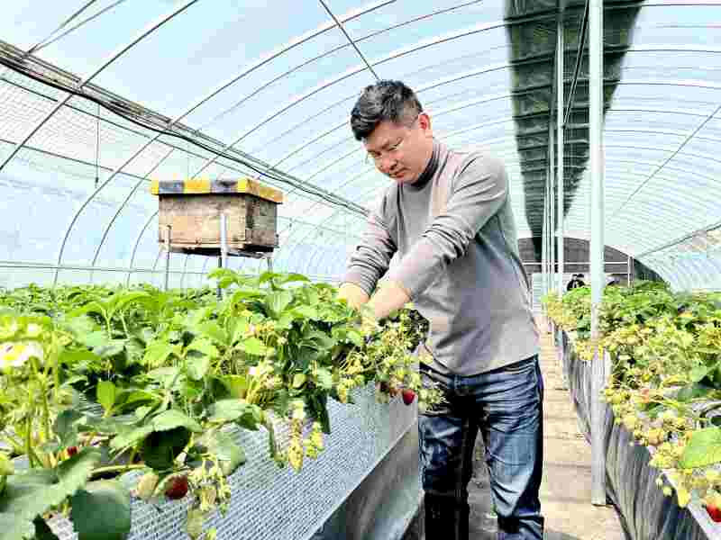 36歲的徐洪,是夏鄭社區人,畢業于揚州大學農學專業。和他一起創業的周康偉來自連云港,是他的大學校友。此前,兩人同在一家房地產公司工作多年。2022年,兩人決定辭去工作回農村創業,草莓的“立架高栽”模式成了他們的首選。